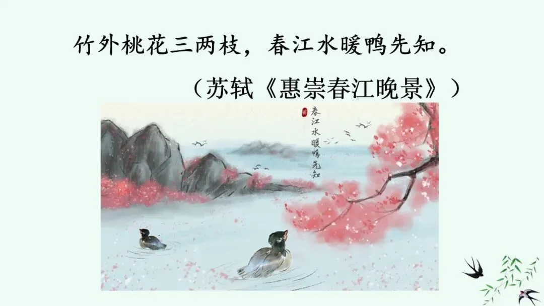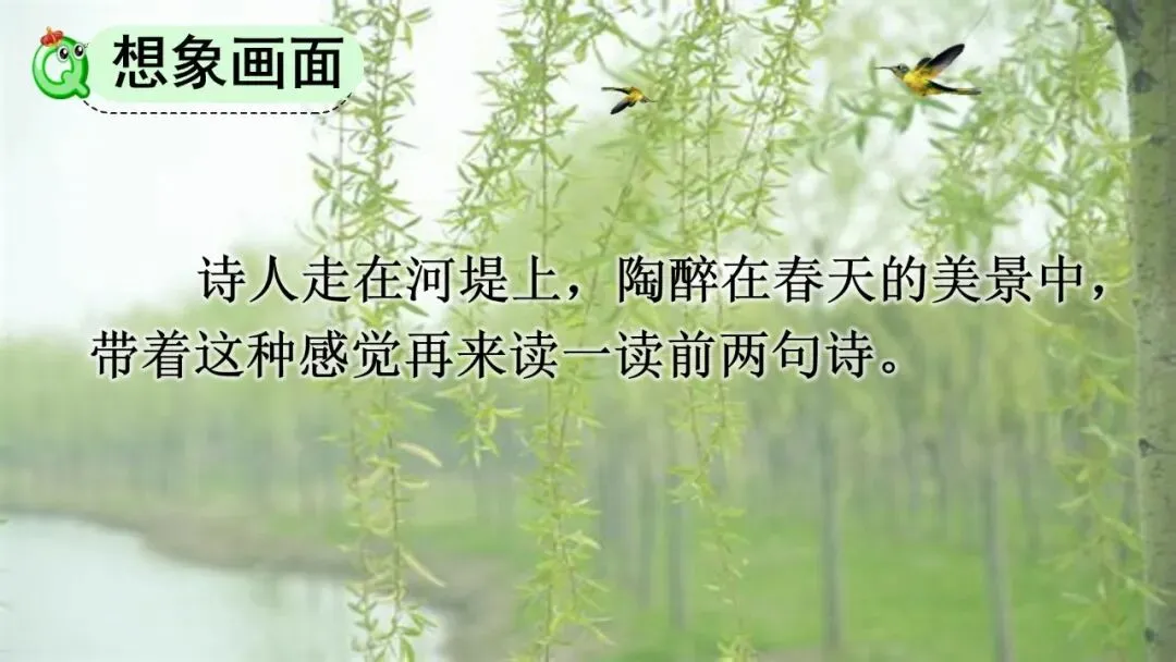 (3)教师引导:诗人走在河堤上,陶醉在春天的美景中,带着这种感觉再来读一读前两句诗。(出示课件33)