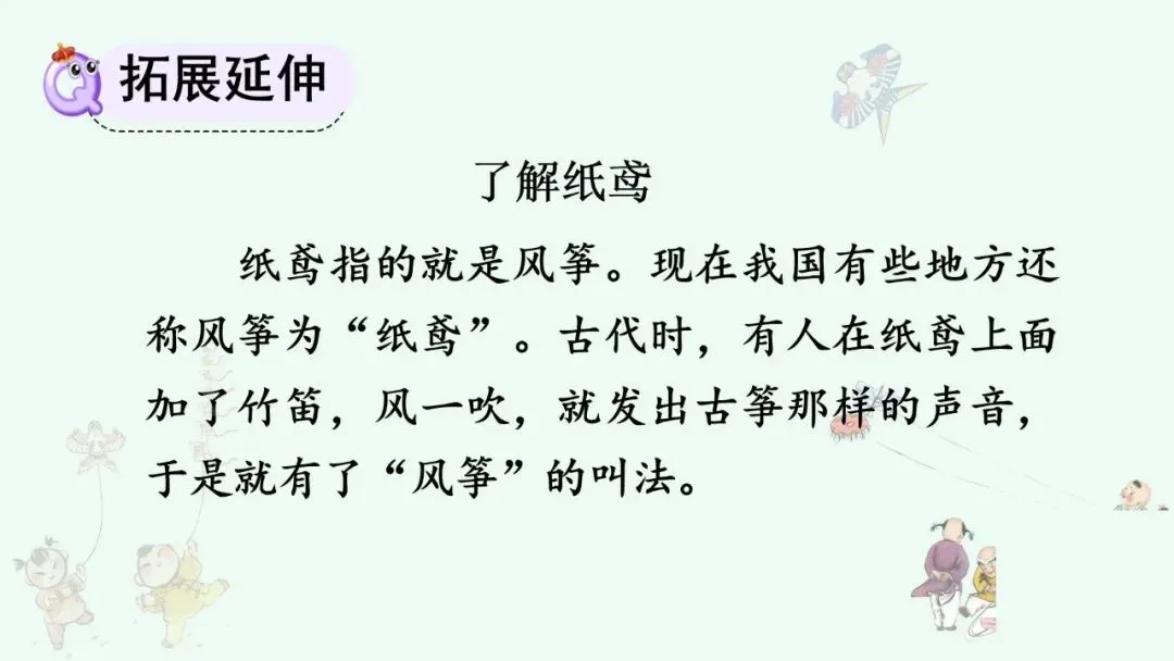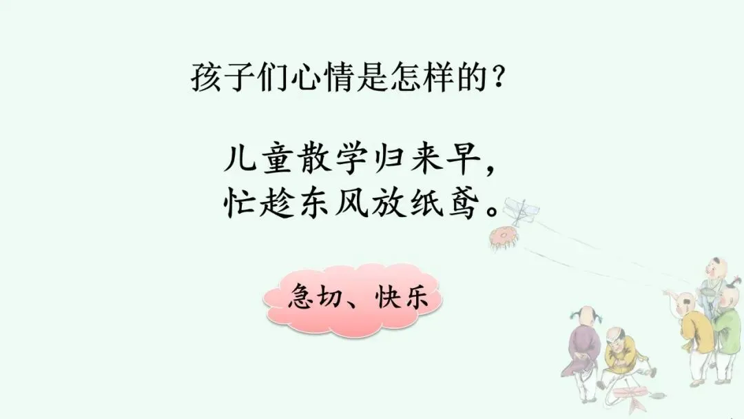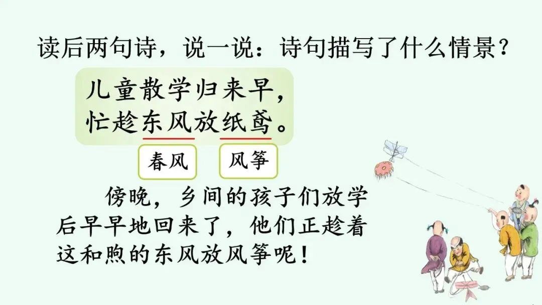 2.学习“儿童散学归来早,忙趁东风放纸鸢”。(出示课件34~36)