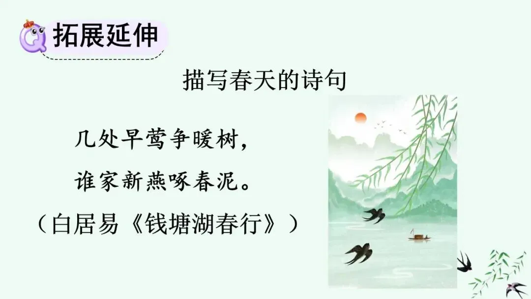 语言运用:能用自己的话说出诗句描述的春天美景。