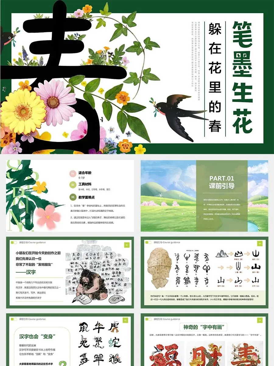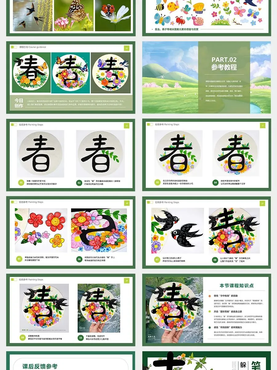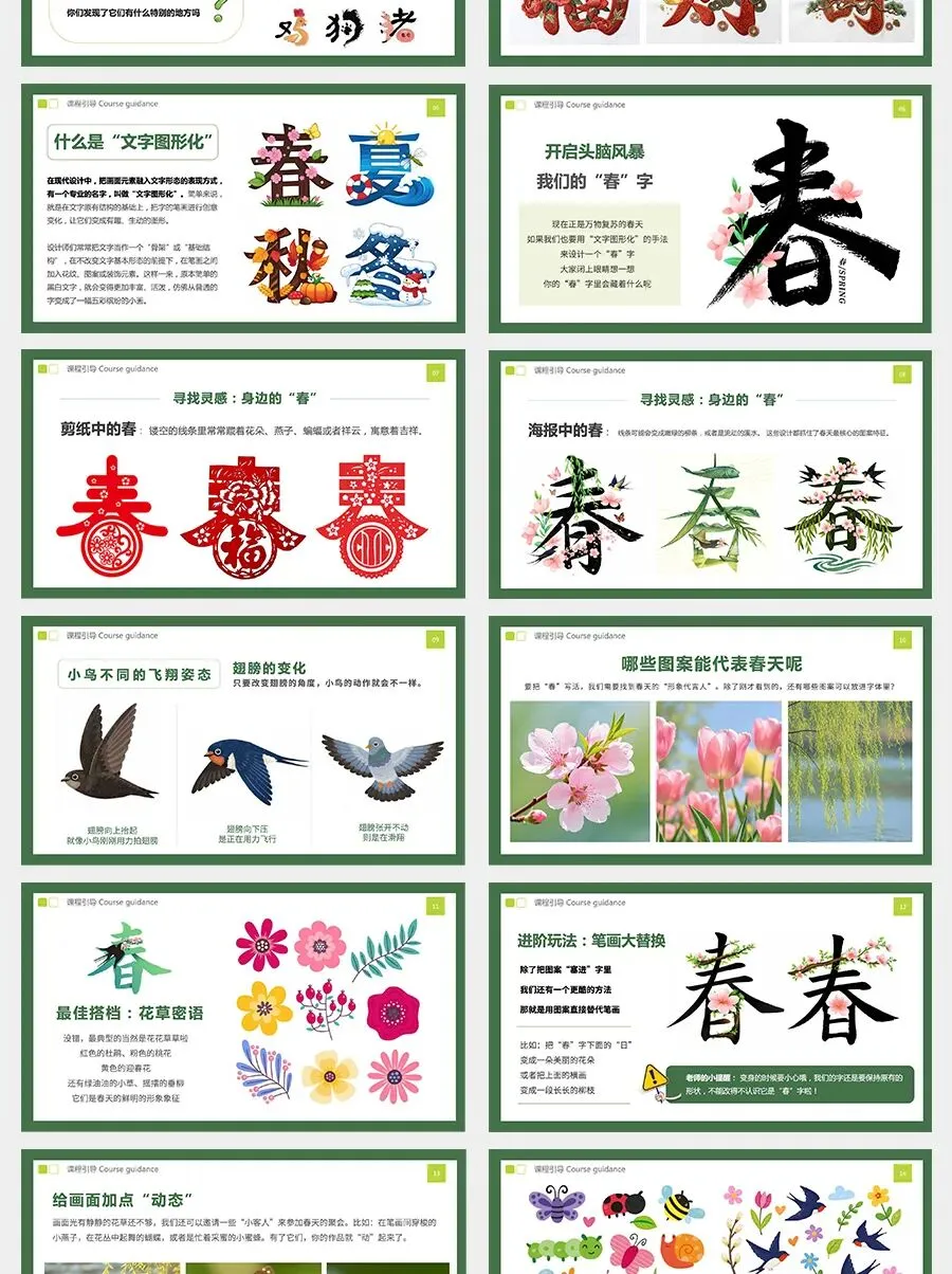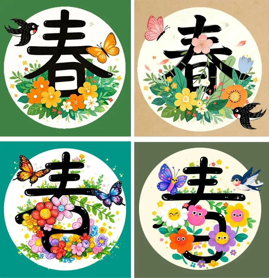 今天,我们就要当一次小小设计师,用“文字图形化”的方法来设计一个特别的“春”字。想一想,春天里有什么呢?我们可以把这些春天的元素藏进“春”字的笔画里,让文字变成一幅充满生机的小画面。现在,让我们打开想象力,用画笔创造一个属于自己的春天的“春”字吧!