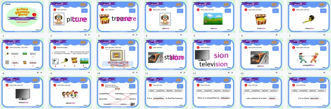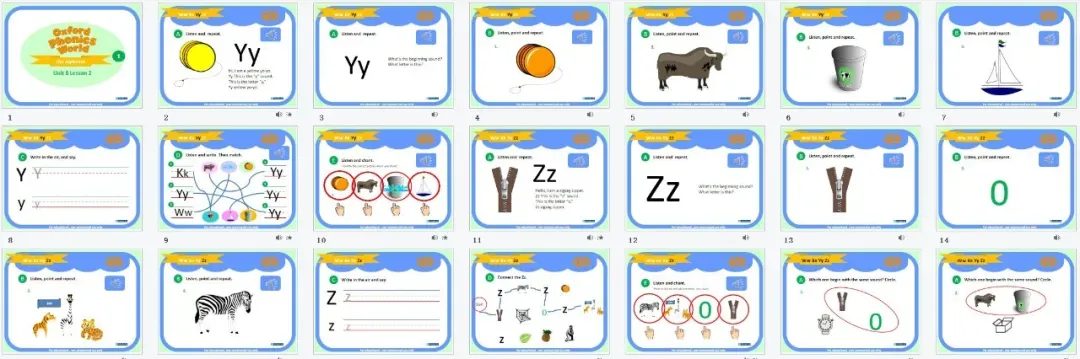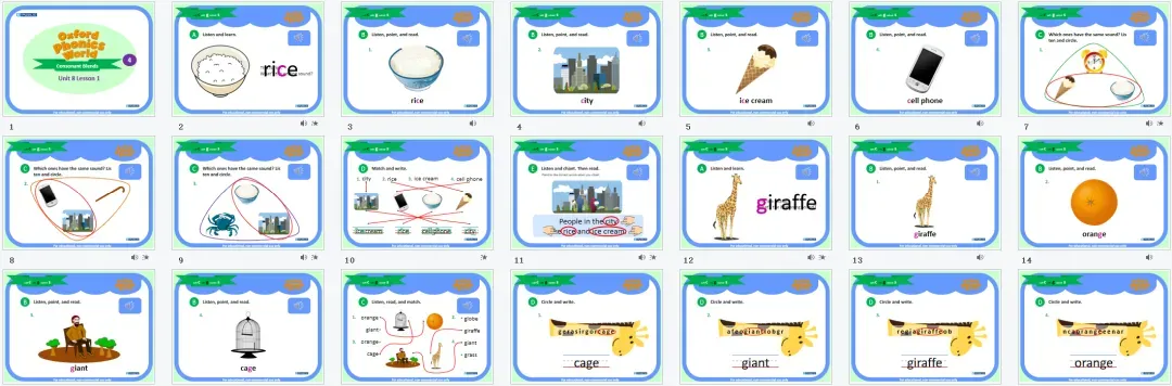 第一个级别一共20个PPT,讲解了26个字母的发音、代表单词、chant和练习:第二个级别一共20个PPT,讲解了短元音和常见cvc词族的发音:第四个级别一共20个PPT,讲解了辅音字母组合的发音:第五个级别一共20个PPT,讲解了r-controlled的元音、复杂元音组合、以及特殊发音:除了课件,配套的教材、练习册、音频也给大家整理好了,学完就能练,一步到位!