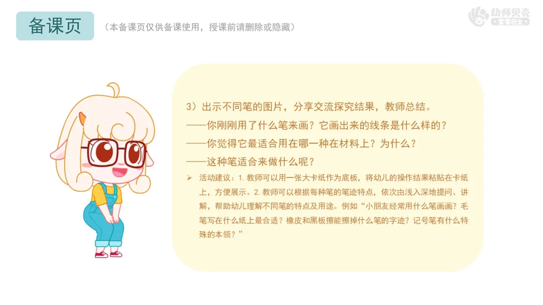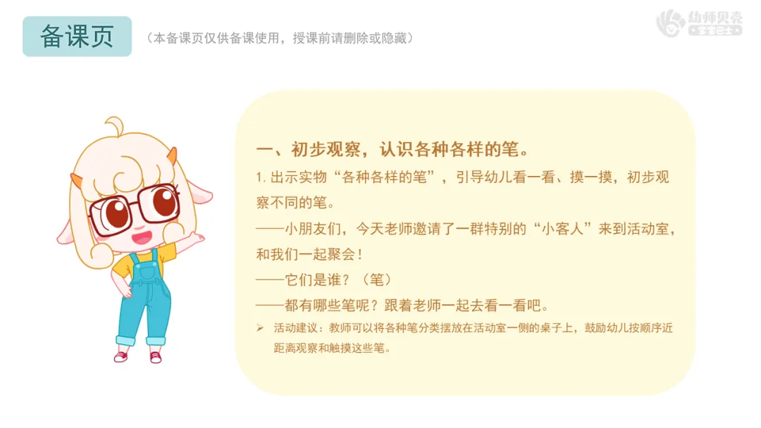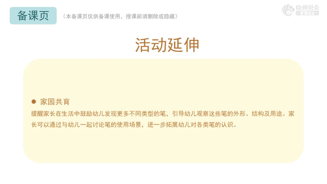 提醒家长在生活中鼓励幼儿发现更多不同类型的笔,引导幼儿观察这些笔的外形、结构及用途。家长可以通过与幼儿一起讨论笔的使用场景,进一步拓展幼儿对各类笔的认识。