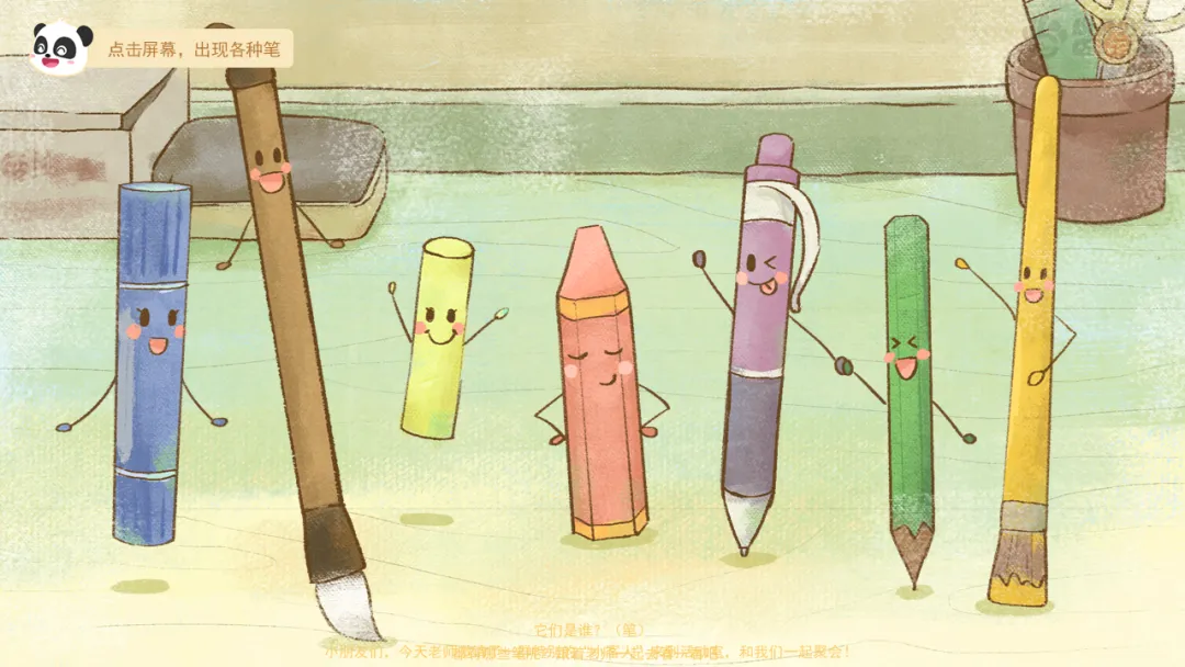 ——小朋友们,今天老师邀请了一群特别的“小客人”来到活动室,和我们一起聚会!它们是谁?(笔)