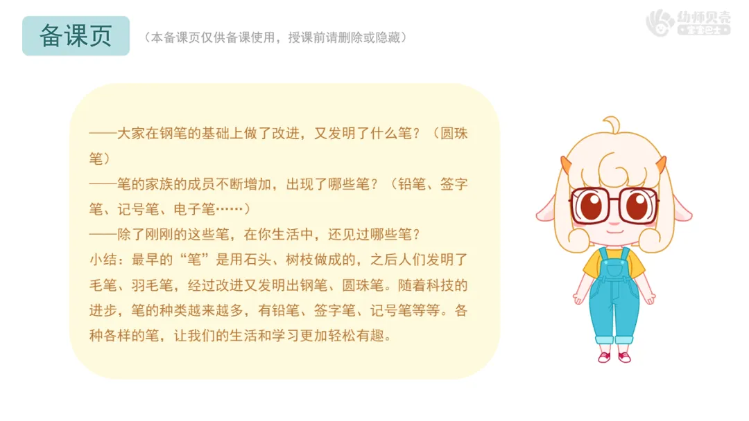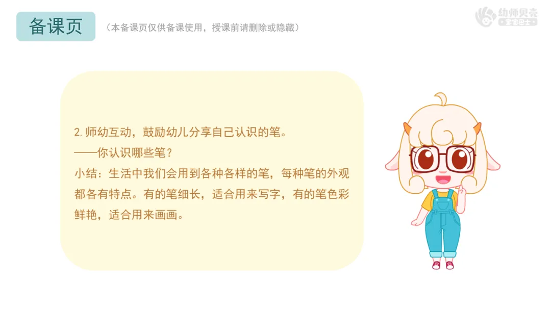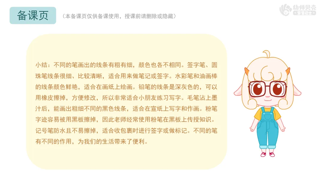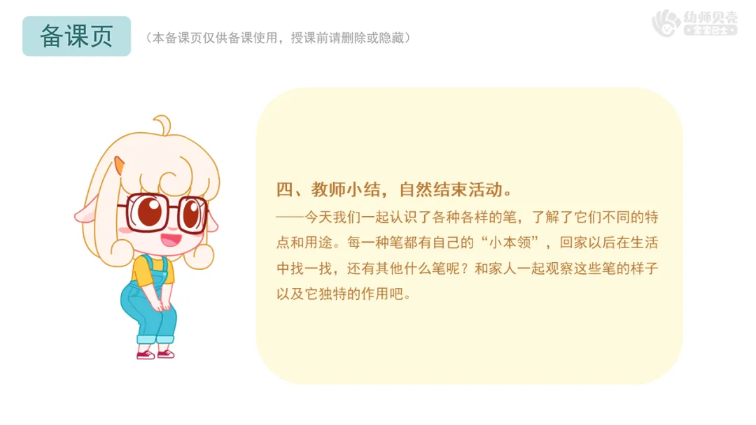 ——今天我们一起认识了各种各样的笔,了解了它们不同的特点和用途。每一种笔都有自己的“小本领”,回家以后在生活中找一找,还有其他什么笔呢?和家人一起观察这些笔的样子以及它独特的作用吧。