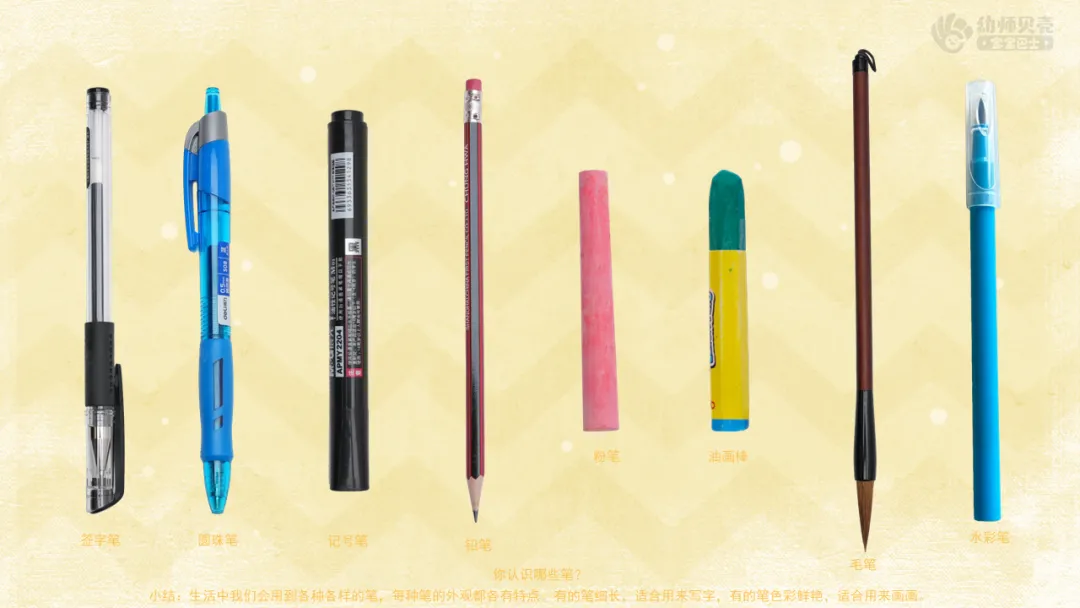 小结:生活中我们会用到各种各样的笔,每种笔的外观都各有特点。有的笔细长,适合用来写字,有的笔色彩鲜艳,适合用来画画。