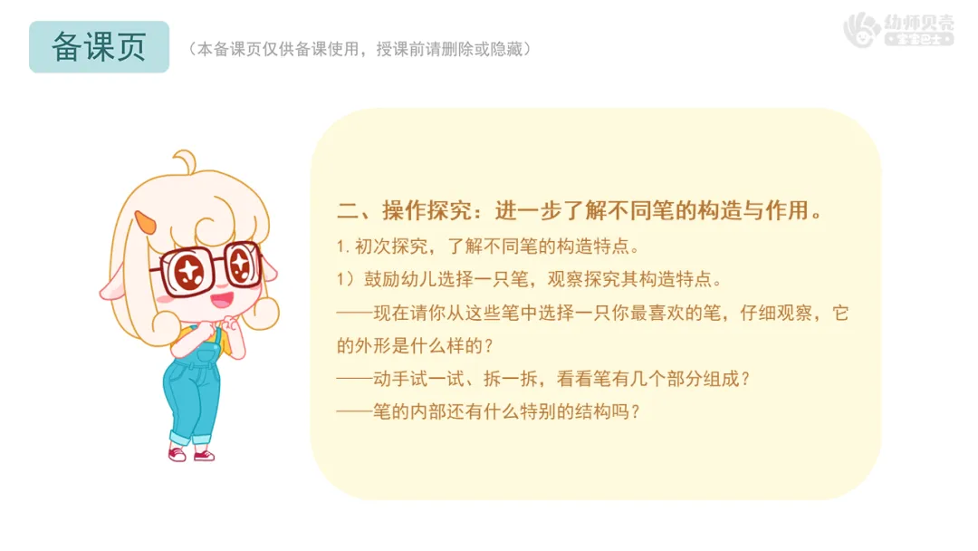 1)鼓励幼儿选择一只笔,观察探究其构造特点。