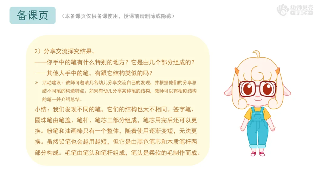 Ø活动建议:教师可邀请几名幼儿分享交流自己的发现,并根据他们的分享总结不同笔的构造特点。如果有幼儿分享某种笔