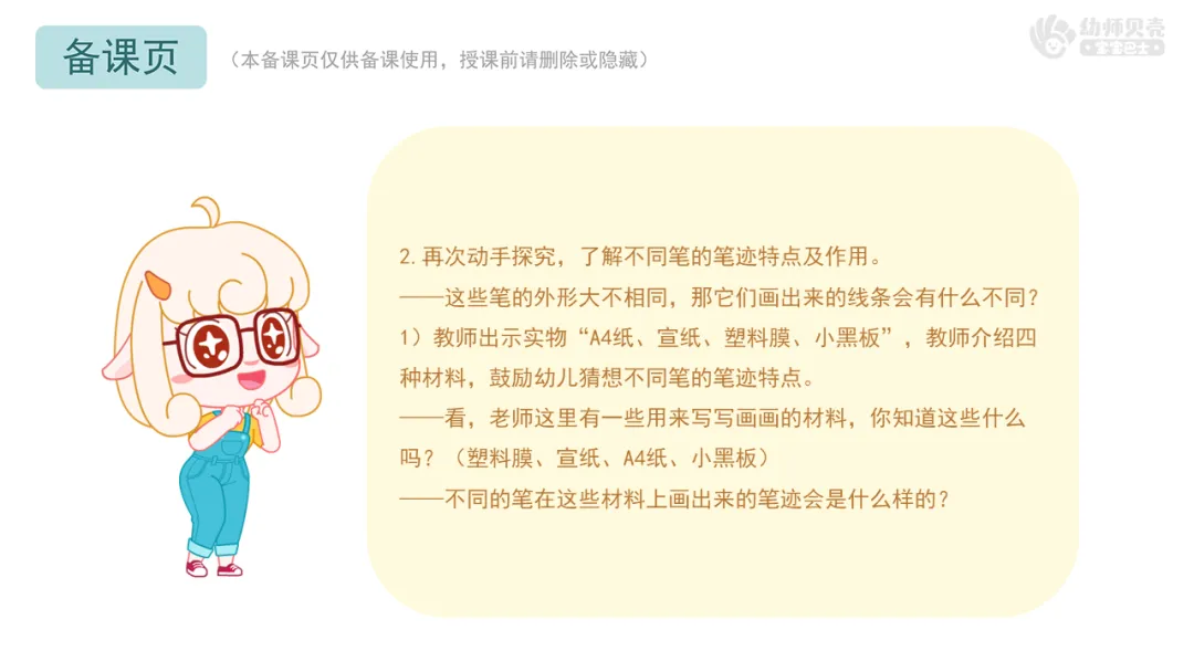 l材料准备:1.第一次操作:签字笔、圆珠笔、粉笔、油画棒、铅笔、毛笔若干(以上材料总