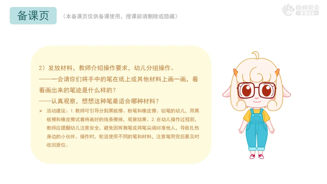 2.在幼儿操作过程前,教师应提醒幼儿注意安全,避免因挥舞笔或将笔尖端对准他人,导致扎伤身边的小伙伴。操作时,轮流使用不同的笔和材料,注意笔用完后要及时收回原位。