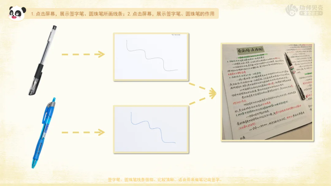 小结:不同的笔画出的线条有粗有细,颜色也各不相同。签字笔、圆珠笔线条很细、比较清晰,适合用来做笔记或签字。水彩笔和油画棒的线条颜色鲜艳,适合在画纸上绘画。铅笔的线条是深灰色的,可以用橡皮擦掉,方便修改,所以非常适合小朋友练习写字。毛笔沾上墨汁后,能画出粗细不同的黑色线条,适合在宣纸上写字和作画。粉笔字迹容易被用黑板擦掉,因此老师经常使用粉笔在黑板上传授知识。记号笔防水且不易擦掉,适合收包裹时进行签字或做标记。不同的笔有不同的作用,为我们的生活带来了便利。
