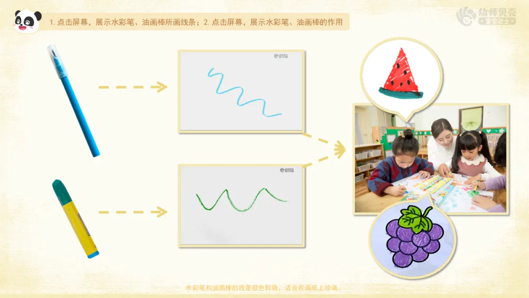 Ø活动建议:1.教师可以用一张大卡纸作为底板,将幼儿的操作结果粘贴在卡纸上,方便展示。2.教师可以根据每种笔的笔