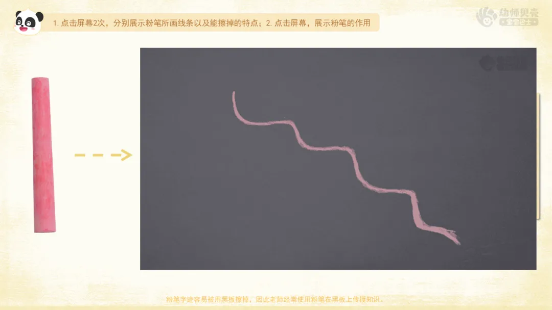 Ø活动建议:1.教师可引导分到黑板擦、粉笔和橡皮擦、铅笔的幼儿,用黑板擦和橡皮擦试着将画好的线条擦掉,观察结果。