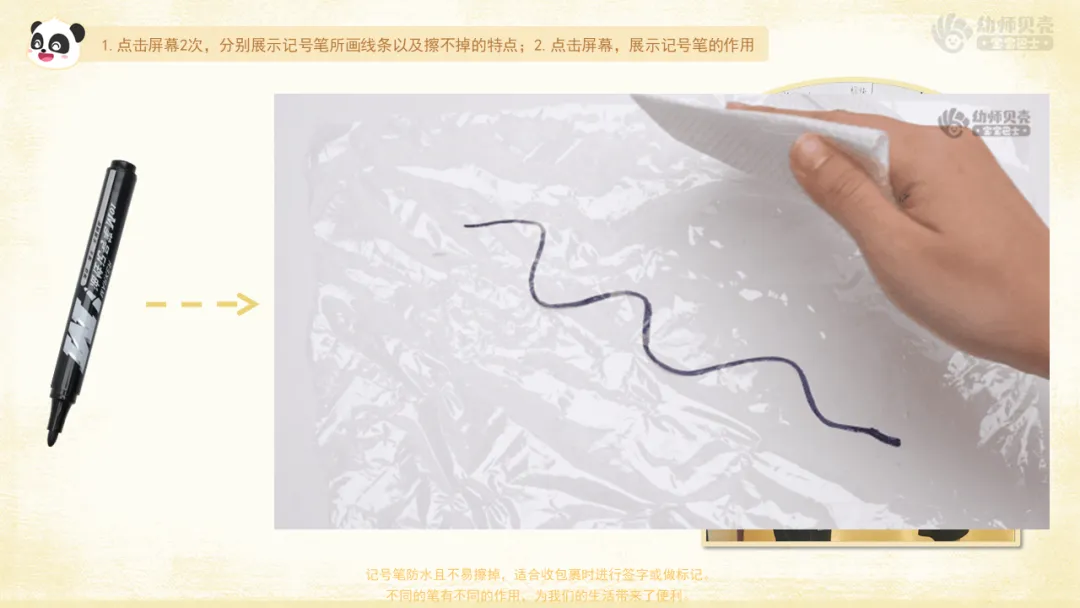④记号笔、水彩笔、塑料膜、纸巾。(以上材料满足全班幼儿,每组材料各不同)。