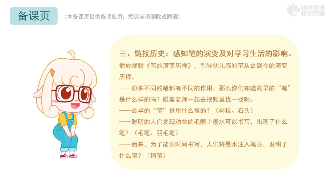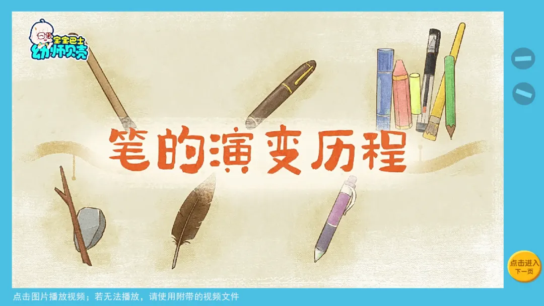 播放视频《笔的演变历程》,引导幼儿感知笔从古到今的演变历程。