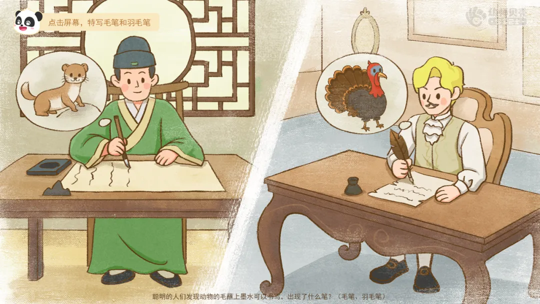 ——聪明的人们发现动物的毛蘸上墨水可以书写,出现了什么笔?(毛笔、羽毛笔)