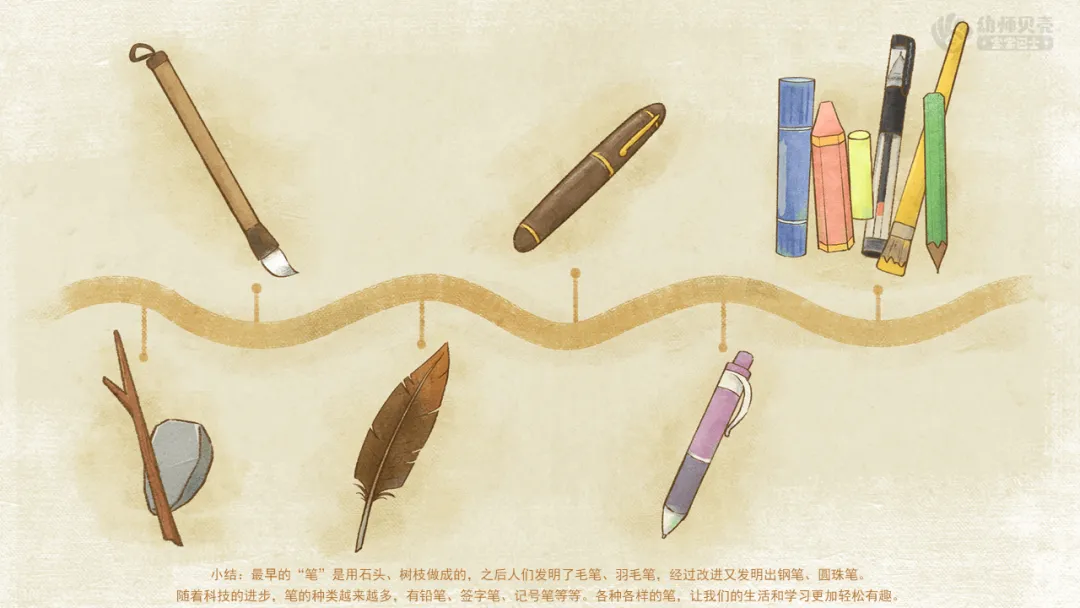 小结:最早的“笔”是用石头、树枝做成的,之后人们发明了毛笔、羽毛笔,经过改进又发明出钢笔、圆珠笔。随着科技的进步,笔的种类越来越多,有铅笔、签字笔、记号笔等等。各种各样的笔,让我们的生活和学习更加轻松有趣。