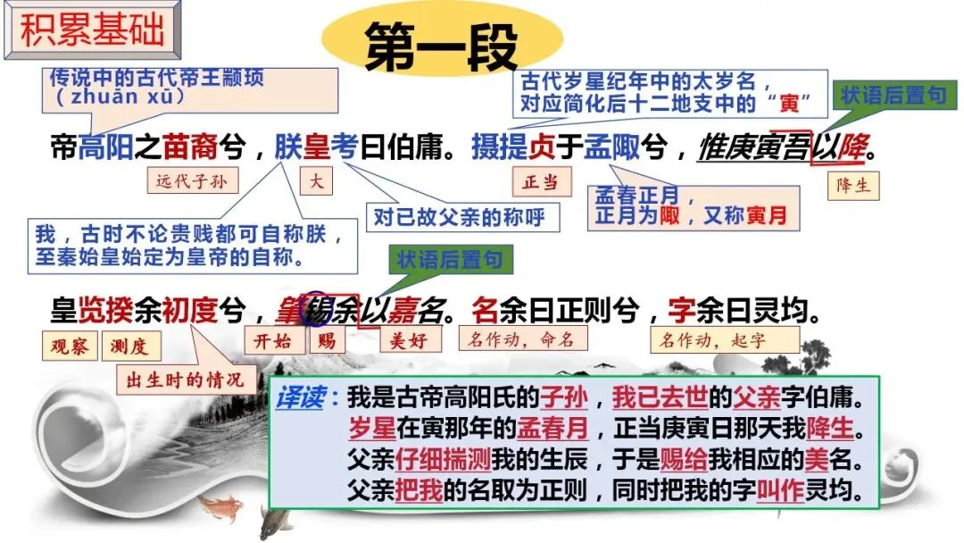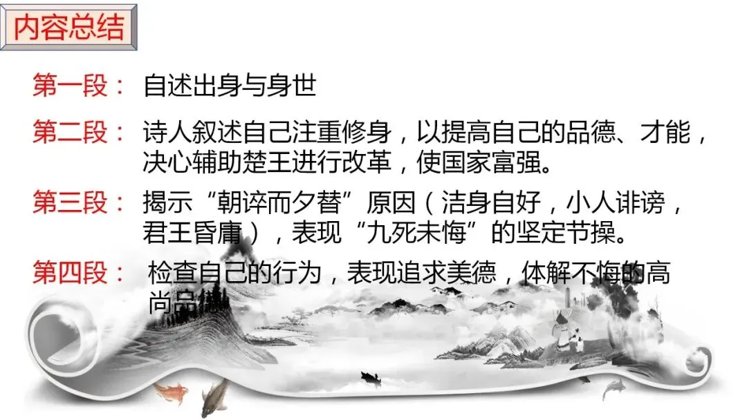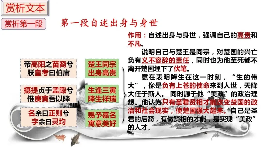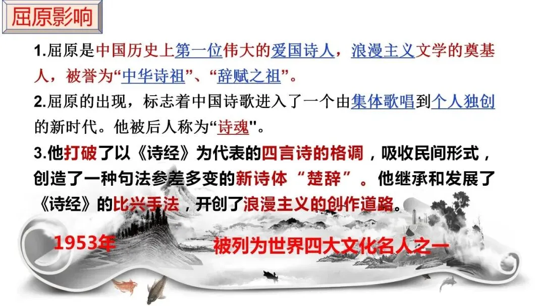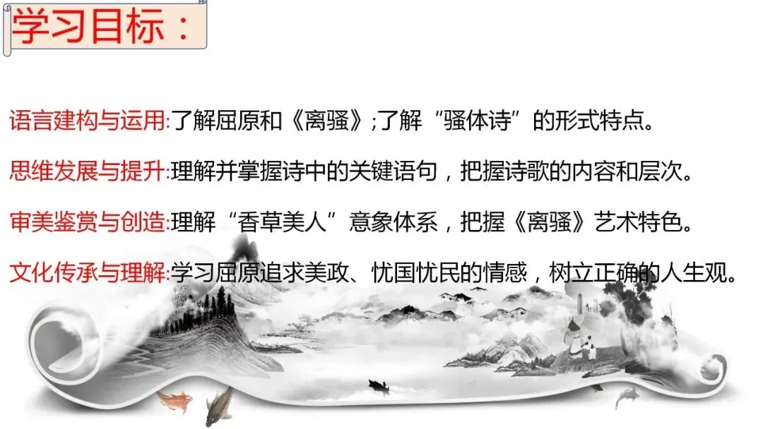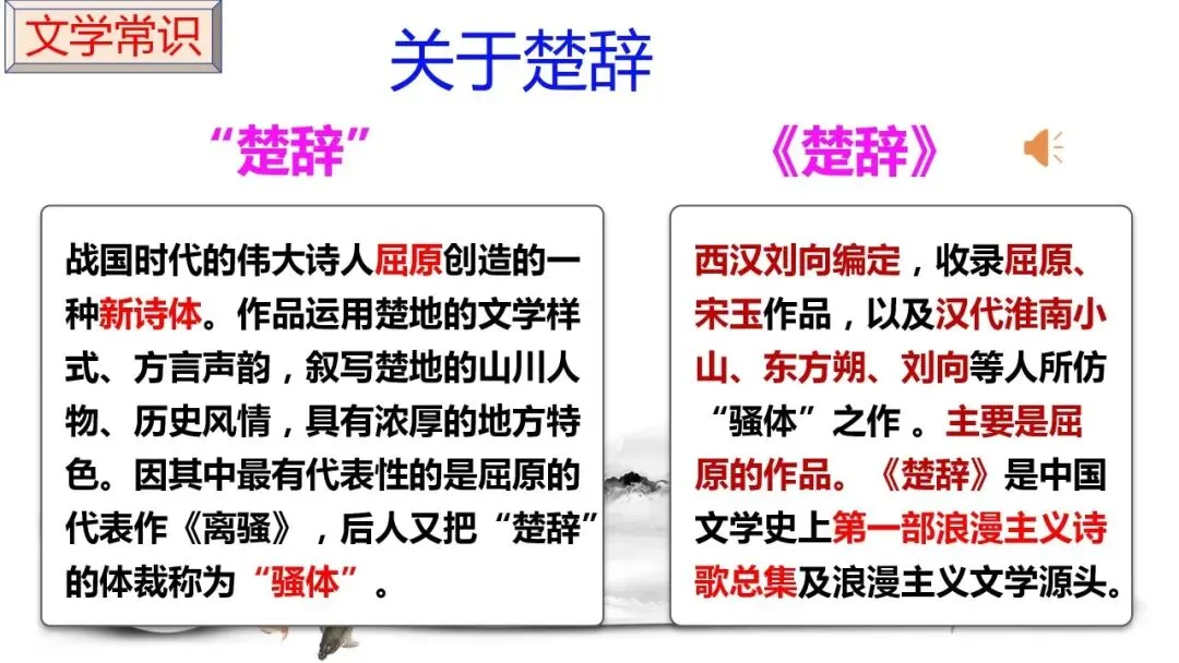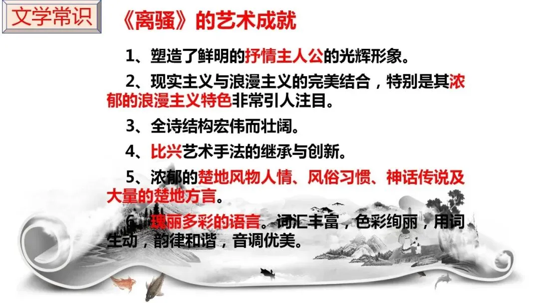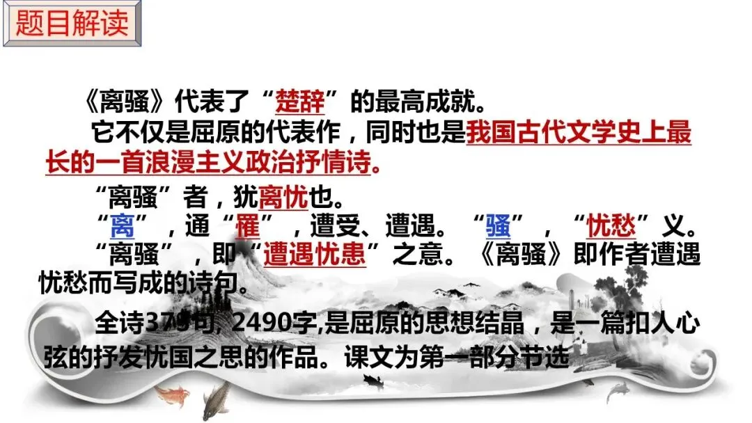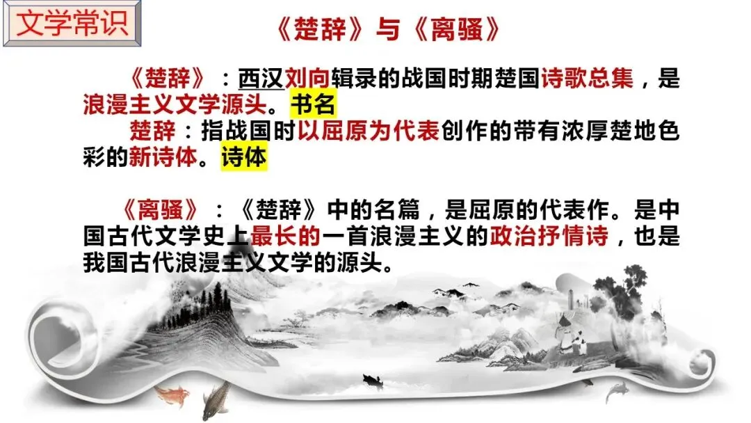 《离骚》是统编版高二语文选择性必修下册第一单元的第一课。作为文学史上最长的抒情诗,《离骚》开创了“楚辞体”和浪漫主义传统,是中国古典诗歌的两大源头之一,与《诗经》并称“风骚”。