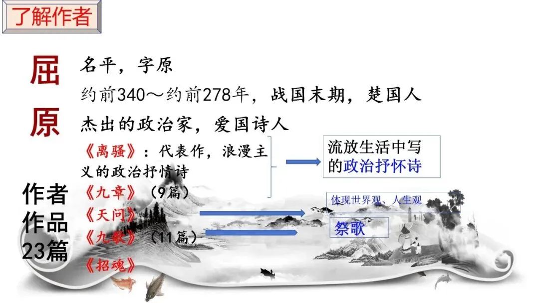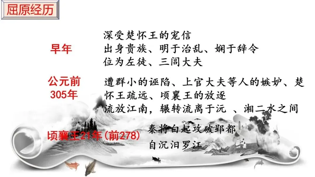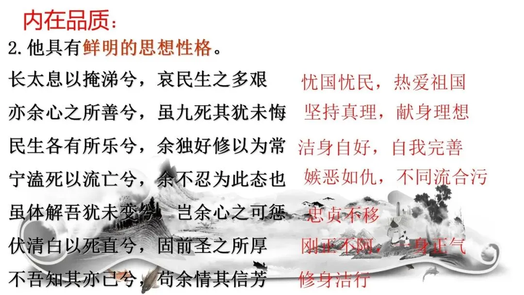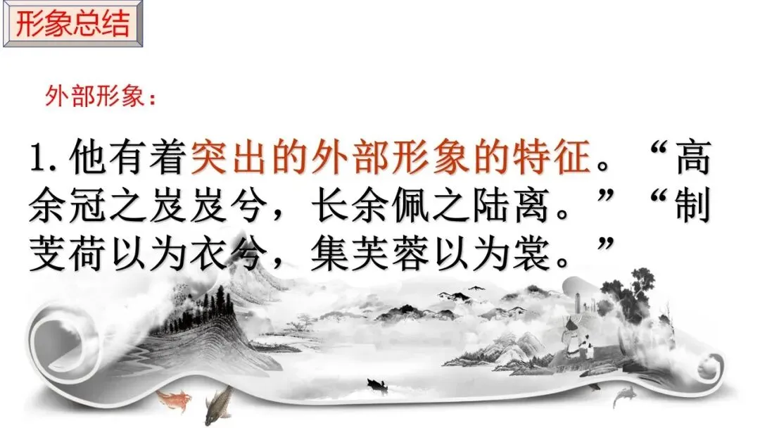 教师总结:我们往前数,有孔子,有屈原,有杜甫这样的先贤,他们给我们构筑的精神世界,是我们中华民族无论碰到什么样的困厄,都能不断前行,都能顽强斗争的原因。同学们,我想这节课屈原听到了,我为你们感到自豪,也为我们祖国的未来感到充满了希望。