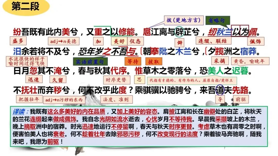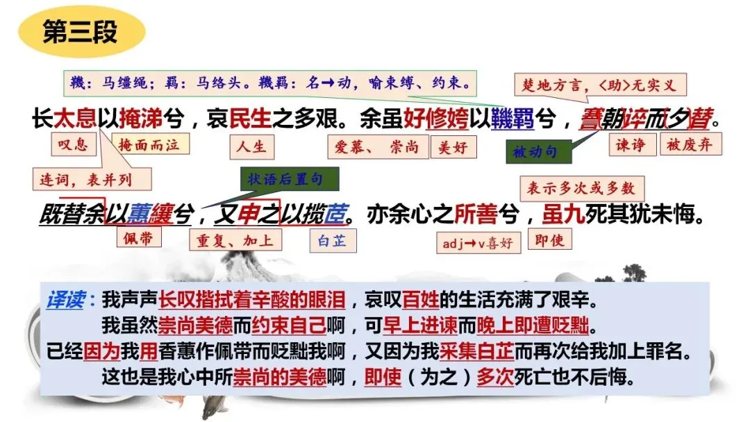 首先,教师提出问题:节选部分第一句和心情有关的句子是哪句?学生找到后齐读:“长太息以掩涕兮,哀民生之多艰”。接着,老师通过询问在座学生的志向,引导其通过坚决地表达自己的志向,找到和体会《离骚》中屈原对其志向的抒发:“亦余心之所善兮,虽九死其犹未悔”。