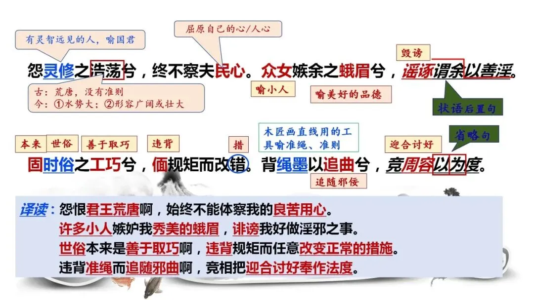 紧扣关键词,教师提醒学生联系上下文思考:是谁害屈原如此“穷困”?学生于“怨灵修之浩荡兮,终不察夫民心”“众女嫉余之蛾眉兮,谣诼谓余以善淫”“固时俗之工巧兮,偭规矩而改错”三个关键句中找到答案:楚怀王,以上官大夫靳尚为代表的小人群体,世俗。