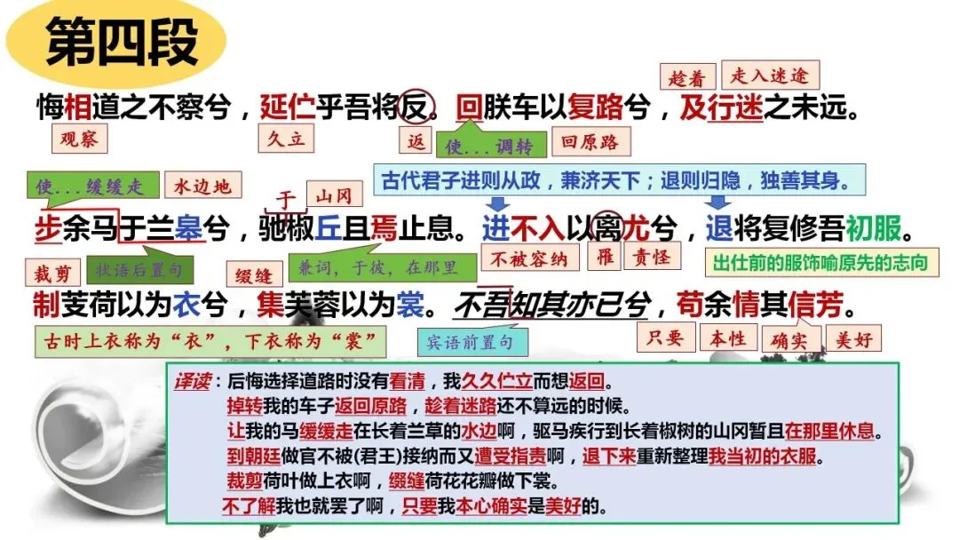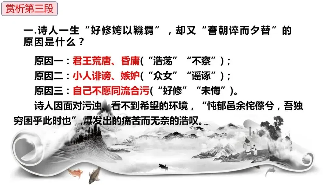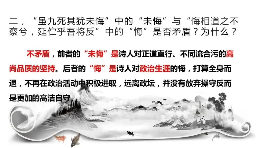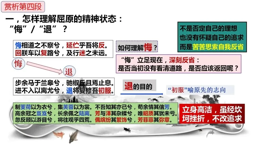 最后,教师引导学生关注到石破天惊的“乐”字——“民生各有所乐兮,余独好修以为常”,人生各有各的爱好,我独爱美好并习以为常。结合课下注释,学生理解“好修”即爱美好。教师提醒学生,此时屈原的情感发生了变化,从“人生至苦”(吾独穷困乎此时也)变成了“人生至乐”(吾独好修以为常),那中间的分界点是何处呢?一步一步的朝前推,学生找到:步余马于兰皋兮,驰椒丘且焉止息。回想过往种种,诗人发出了“悔相道之不察兮,延伫乎吾将反。回朕车以复路兮,及行迷之未远”的想法,于是他开始东奔西突,寻求出路,远离官场,到山水间,归入大自然的怀抱。