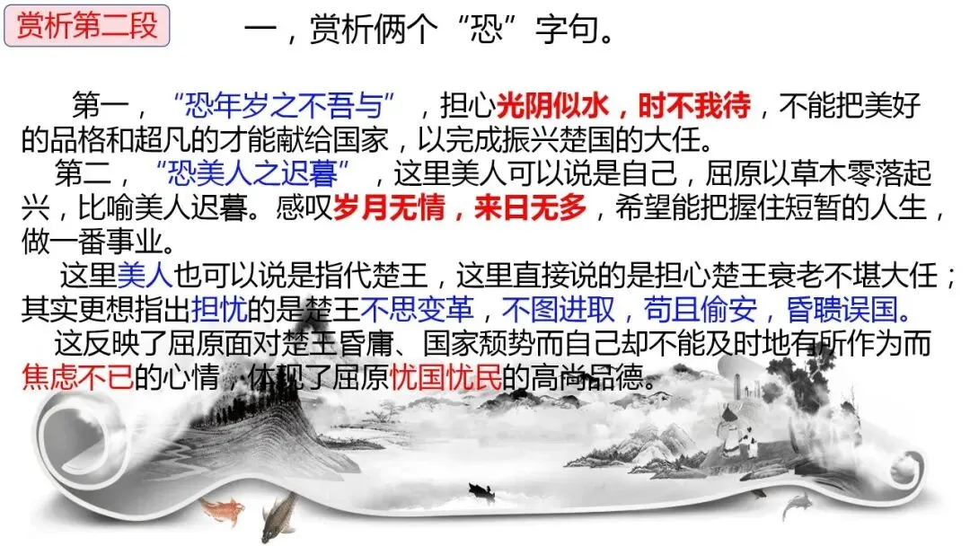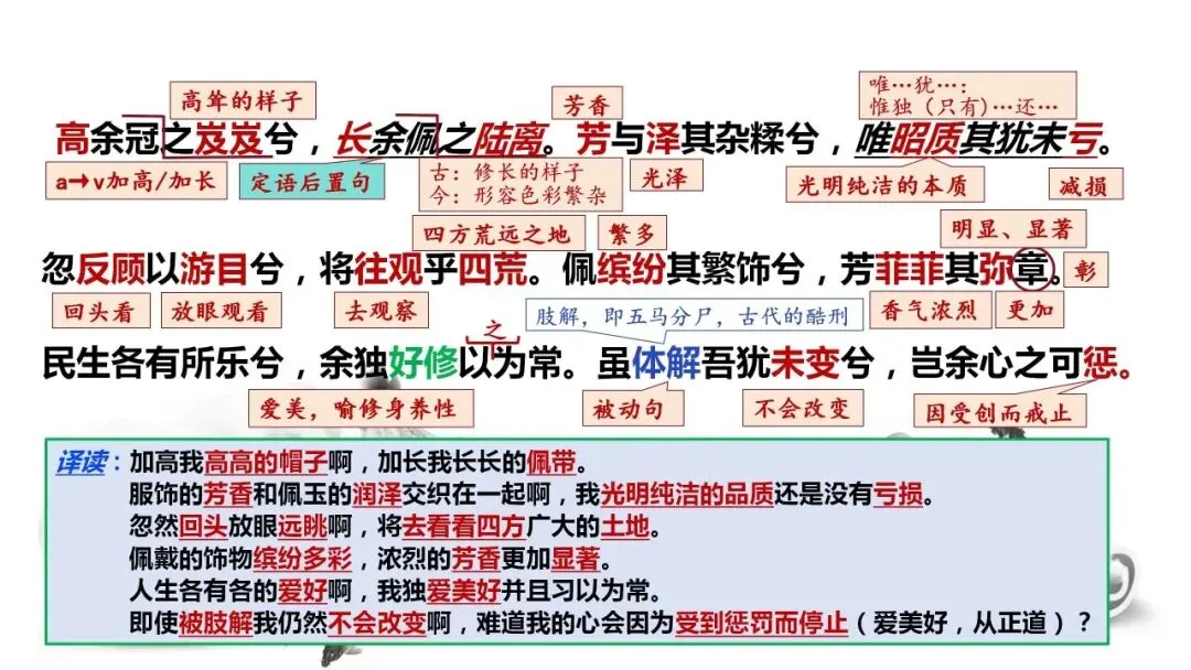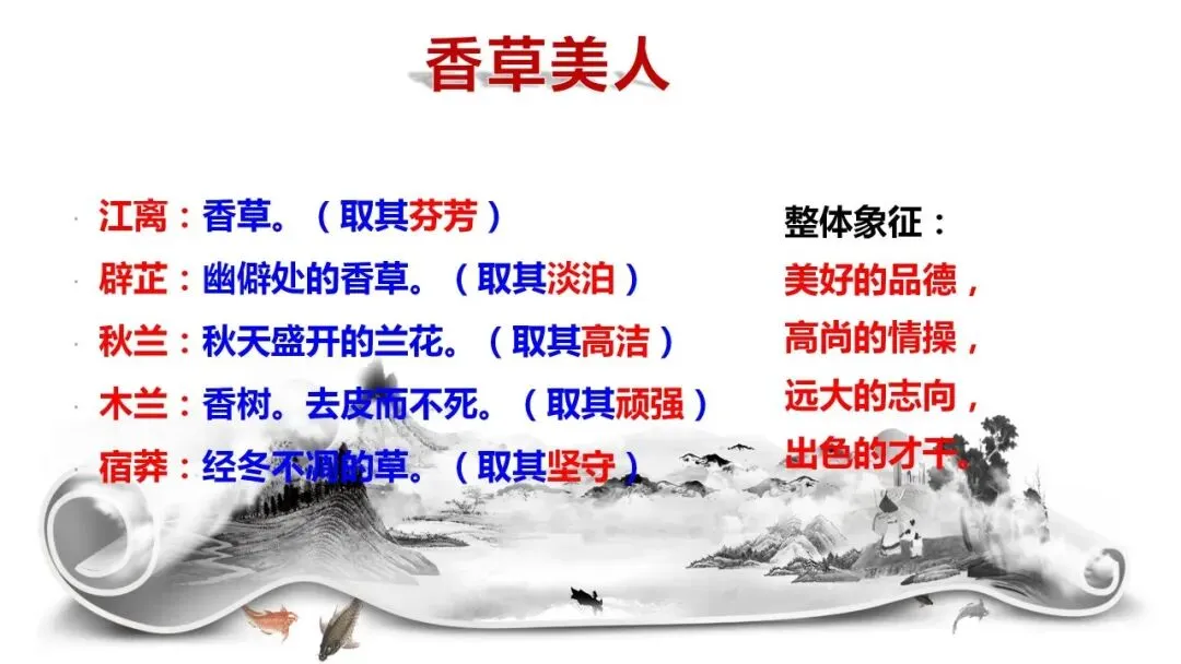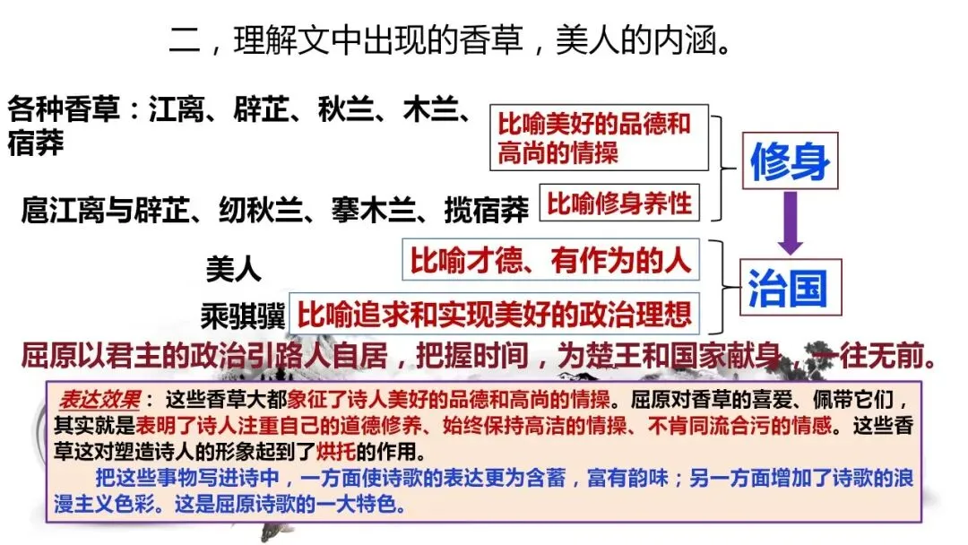 以往本课的教学重点往往聚焦于“香草美人”意象的讲解,然而,由于情感和时代的隔阂,学生往往难以深刻领会屈原的悲剧命运及其现实意义。本文将从“忄”和“艹”两个偏旁切入文本,层层细读,深入文本,引导学生理解屈原心志,体会其悲剧命运与主动选择。
