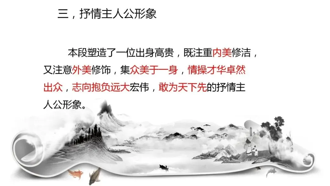 教师总结道:如果说独穷困是这个世界给予诗人的强烈的厄运,强烈的打击的话,那么“独好修”是诗人对命运的什么?反抗、还击和超越。所以我说,国王有国王的权杖,可是诗人有诗人的权杖。我想离骚的伟大就在于屈原对悲剧命运的浪漫主义的超越。因超越,得自由。(PPT中引王德峰《艺术哲学》的内容:“悲剧表现了人对最残酷命运的自由态度”,增进学生对文本的理解。)