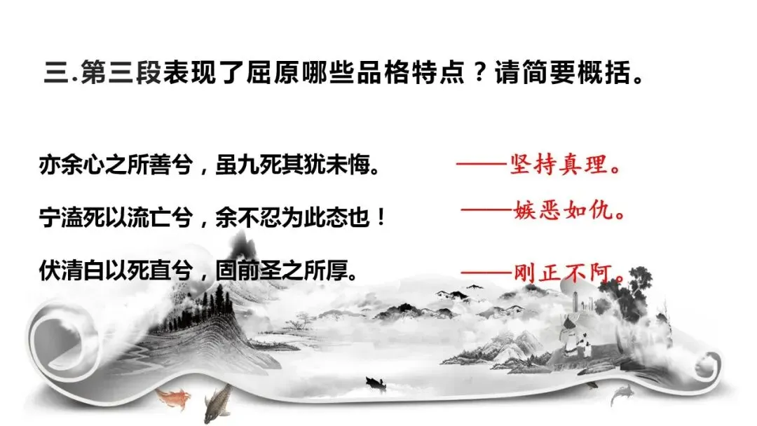 此处,教师通过李长之在《司马迁的人格与风格》中的短评为课堂注入深度思考的活水,使学生借助更高的视角看到屈原的价值与意义——“邪曲害公,方正不容,就是中国整个社会上下五千年的总罪状,屈原的价值乃是在对这种社会作战。”