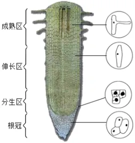 【提问2】根尖分为哪几个结构?根毛位于哪个结构? 【展示】图片:标记法展示各部位。 【提问3】幼根的生长主要是由哪些结构决定的?哪个结构生长最快?不同结构的细胞有什么特点?各有什么功能? 【归纳】绘图填表:根尖各部位的细胞特点及其功能。 【引导】学生推出结论:幼根的生长一方面靠分生区细胞的分裂增加细胞的数量,另一方面主要靠伸长区细胞的伸长增加细胞的体积。 【提问4】生活中移栽幼苗时,为什么要保留土团? | 【回答2】根尖分为根冠、分生区、伸长区、成熟区;根毛位于成熟区; 【回答3】分生区和伸长区;伸长区生长最快;根冠位于根尖顶端,细胞比较大,排列不整齐;保护作用;分生区细胞很小,排列紧密,通过分裂产生新细胞,不断补充伸长区细胞的数量;伸长区细胞长,下部细胞小,越往上细胞越大,是根生长最快的部位;成熟区表皮细胞一部分向外突出形成根毛,是根吸收水和无机盐的主要部位。 【回答4】保护根毛和幼根,利于吸水。 |