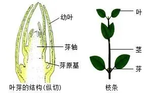 三、枝条的发育 【朗读】古诗:“碧玉妆成一树高,万条垂下绿丝绦。不知细叶谁裁出,二月春风似剪刀。” 【展示】带有芽的枝条、叶芽的结构及其发育示意图
