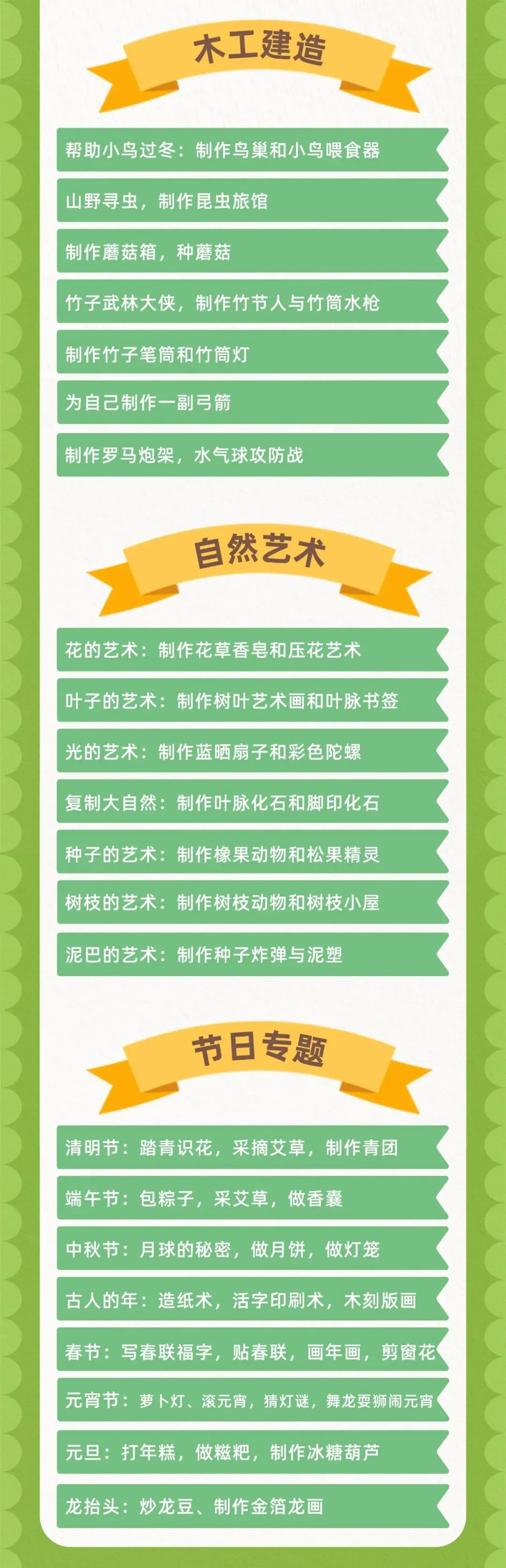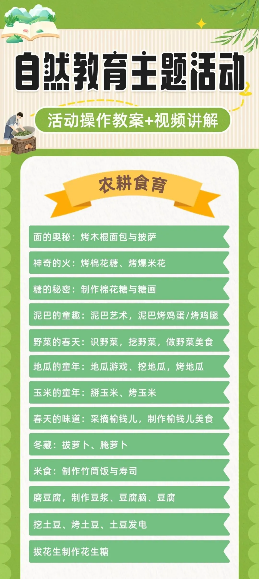 本次主题活动教案涵盖了五大领域(农耕食育、自然博物、科学科技、木工建造、自然艺术)和一个节日专题内容,56节主题活动,数量丰富,涵盖一年四季不同场景使用。旨在让学员获得多元化的学习,开拓儿童视野,培养儿童综合能力,获得全面的发展。并且活动主题新颖,可以激发学员学习和家长报名的兴趣。