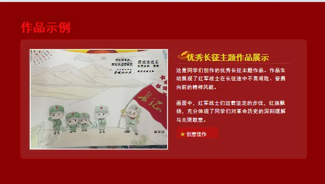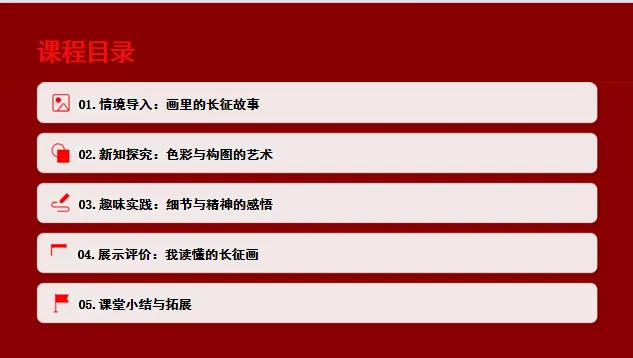 内容维度:以“长征主题美术作品”为核心,通过“析色彩情感、品艺术手法、赏细节精神”等活动,引导学生从美术视角感知长征的艰辛与伟大,理解作品的艺术表达与精神内涵;