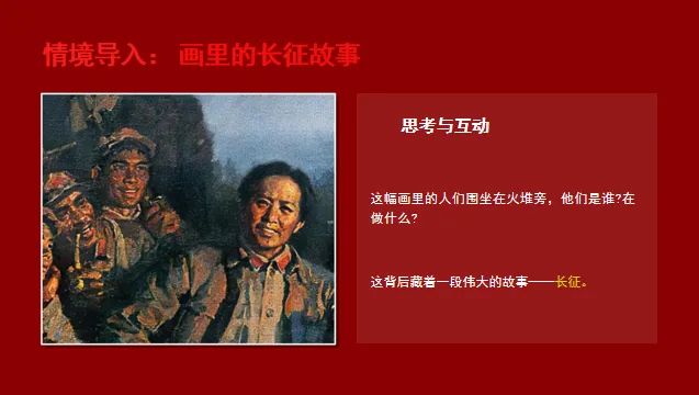 1.教师展示《革命理想高于天》作品,提问:“这幅画里的人们围坐在火堆旁,他们是谁?在做什么?这背后藏着一段伟大的故事——长征。”