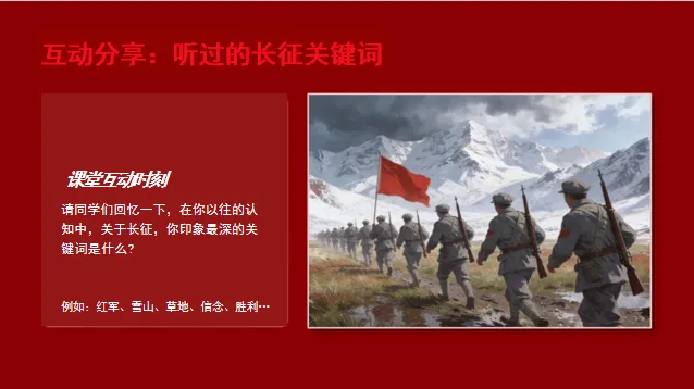 2.互动分享:请学生说说“听过的长征关键词(如红军、雪山、草地)”;