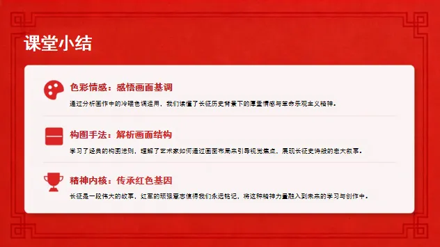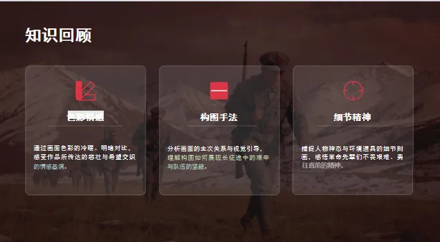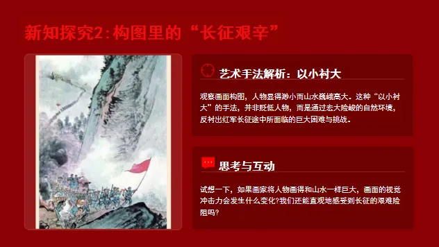 情感维度:渗透“感受长征精神、理解美术作品的精神表达”的美育与德育目标,实现审美感知与红色文化传承的融合。