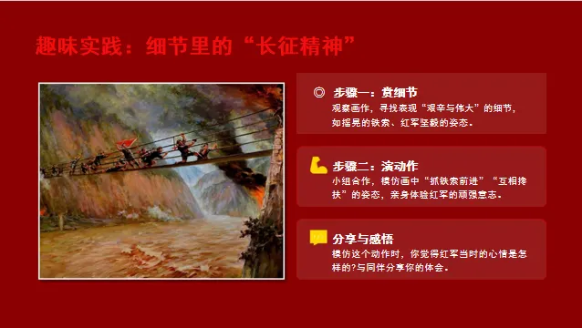 步骤1:赏细节观察《飞夺泸定桥》,找表现“艰辛与伟大”的细节(如摇晃的铁索、红军的姿态);
