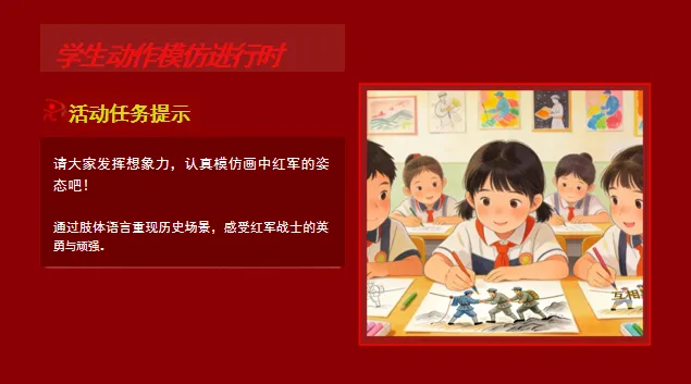 形式维度:以“美术欣赏+情感体验”为线索,用色彩描述、动作模仿等三年级易参与的形式,将美术赏析与红色文化教育结合;