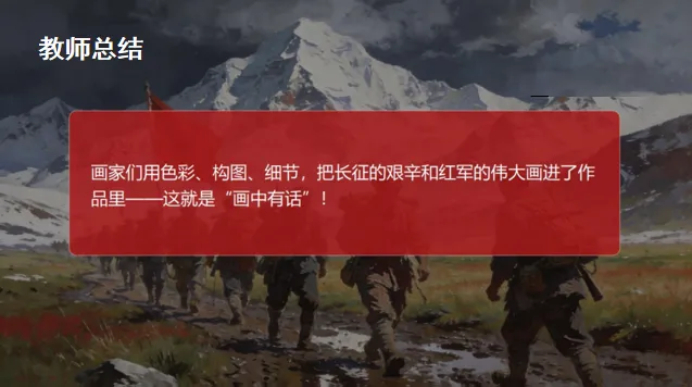 3.教师总结:“画家们用色彩、构图、细节,把长征的艰辛和红军的伟大画进了作品里——这就是‘画中有话’!”