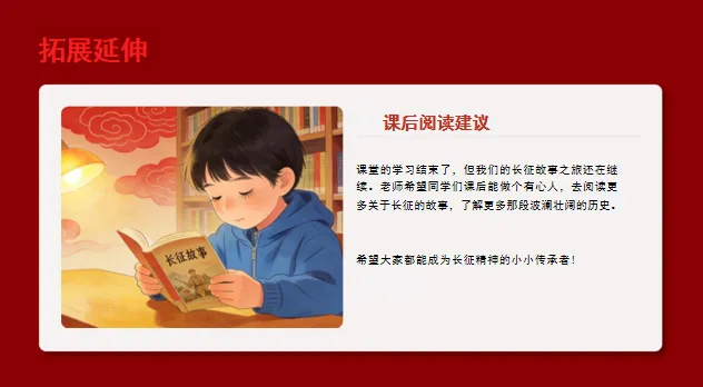 3.改进方向:下次教学可准备“长征场景对比图”(如“红军与雪山的大小对比”),补充简短的长征故事音频,帮助学生深化认知。