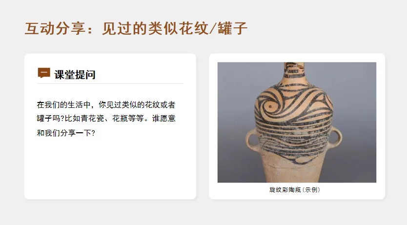 2.互动分享:请学生说说“见过的类似花纹/罐子”,引出“彩陶是先祖生活的‘记录册”;