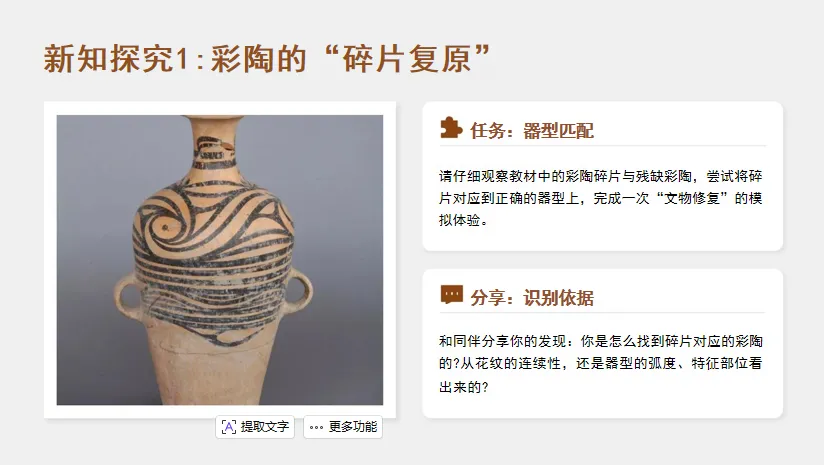 内容维度:以“彩陶的器型、纹样与文化”为核心,通过“复原彩陶碎片、猜器型功能、画彩陶纹样”等活动,引导学生感知彩陶的艺术特点,理解其承载的先祖生活与精神信仰;