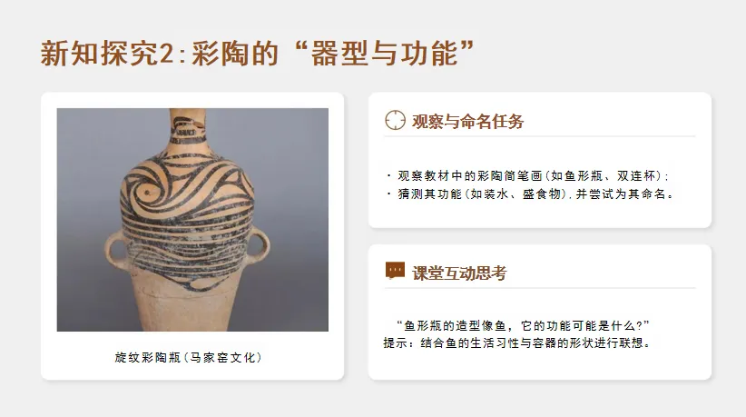 任务:观察教材中的彩陶简笔画(如鱼形瓶、双连杯),猜测其功能(装水、盛食物),并给器型起名;