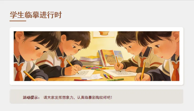 形式维度:以“文化探究+创意实践”为线索,用碎片复原、纹样临摹、创意设计等三年级易参与的形式,将彩陶文化学习与美术创作结合;