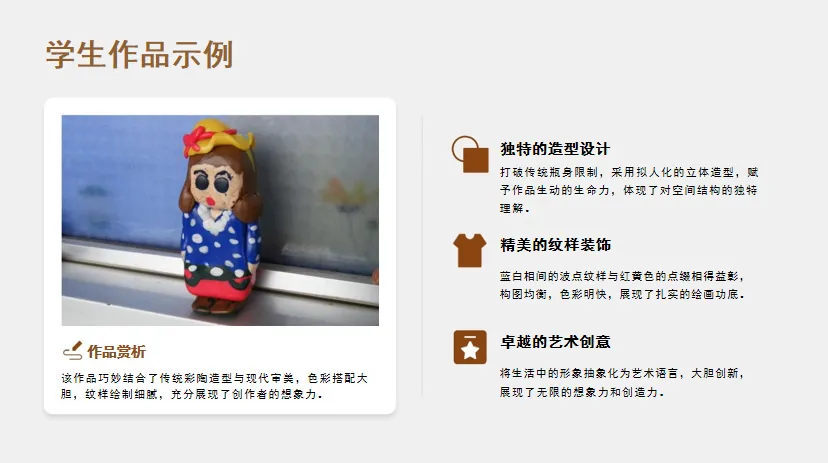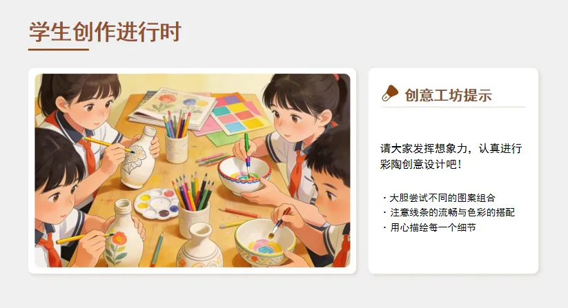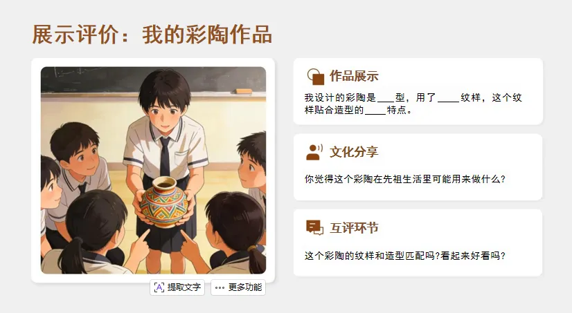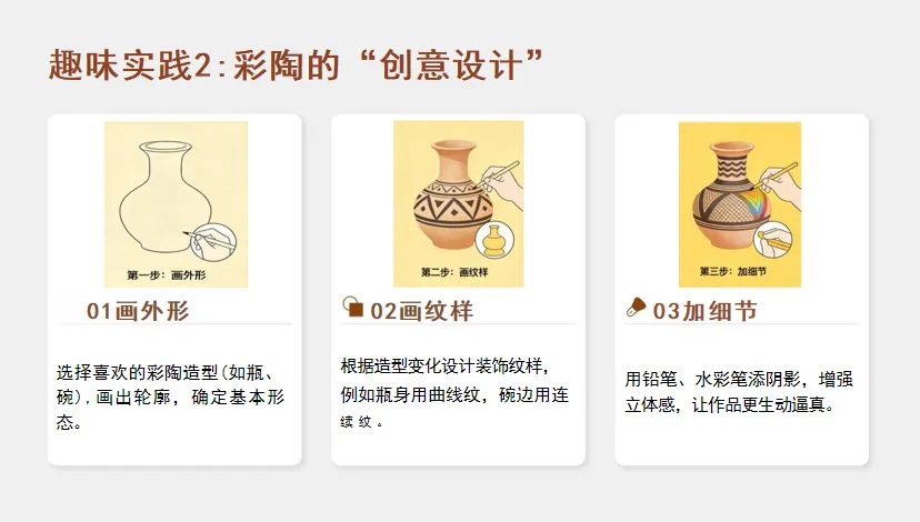 3.教师总结:“彩陶的器型藏着先祖的生活需求,纹样记着先祖的审美——你们的作品,也像先祖一样‘把生活画进器物里’!”