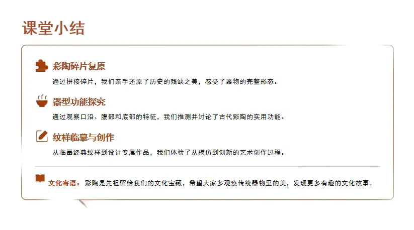 今天我们复原了彩陶碎片、猜了器型功能、画了彩陶纹样,还设计了自己的彩陶作品。彩陶是先祖留给我们的文化宝藏,以后可以多观察传统器物里的美哦!