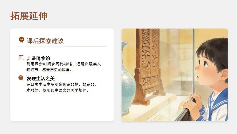 3.改进方向:下次教学可准备“彩陶造型-纹样对应卡”(如“圆瓶身→弧形纹”),补充彩陶纹样的寓意资料(如“旋纹象征水流”),帮助学生深化认知。