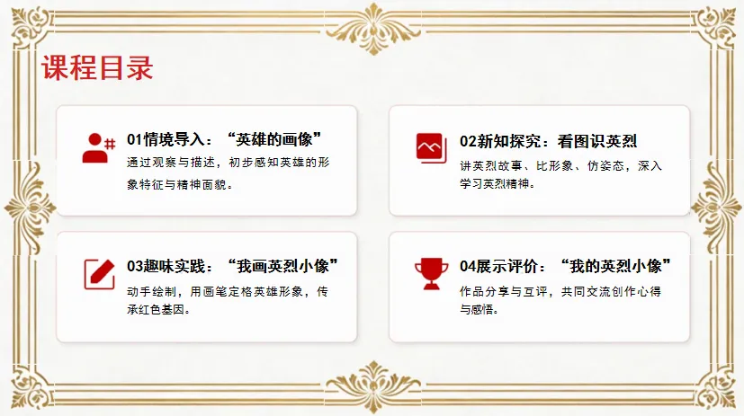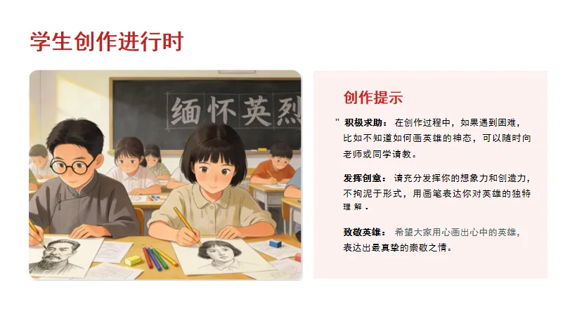 情感维度:渗透“缅怀英烈、学习精神”的德育目标,将美术欣赏与红色文化教育结合,实现美育与德育的融合。