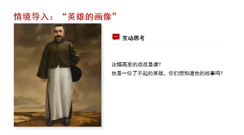 1.教师展示教材中李大钊油画作品,提问:“这幅画里的叔叔是谁?他是一位了不起的英雄,你们想知道他的故事吗?”