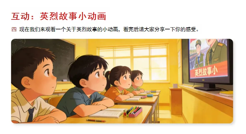 2.互动:播放1分钟“英烈故事小动画”(如李大钊的简要事迹),引发学生兴趣;