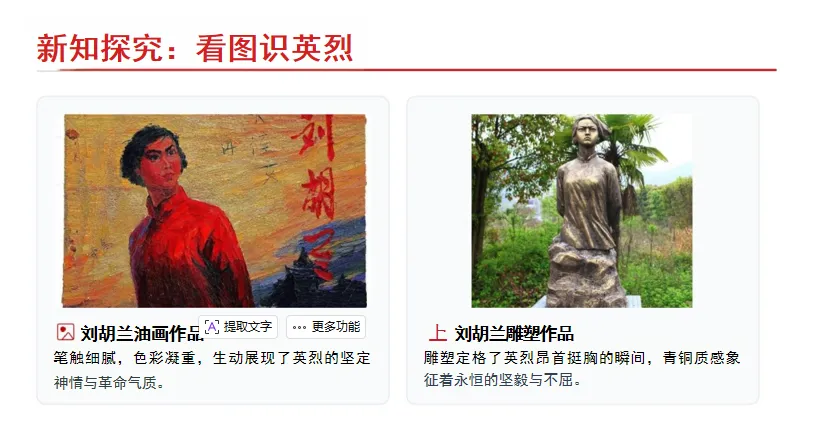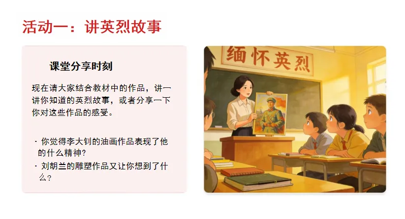 学生分享:请2-3位学生讲自己知道的英烈故事(如刘胡兰),教师辅助关联教材中的对应作品(油画/雕塑)。